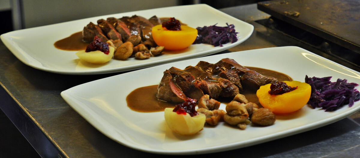 Garniture chasse : Spätzli, Marrons glacés, Purée de Courge, Choux rouges et de Bruxelles, confiture aux Airelles